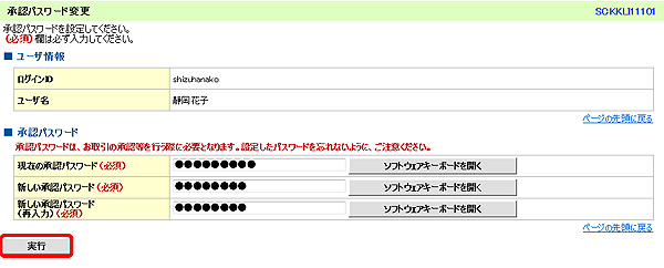 承認パスワード(2箇所)を設定し、[実行]ボタンをクリックしてください。