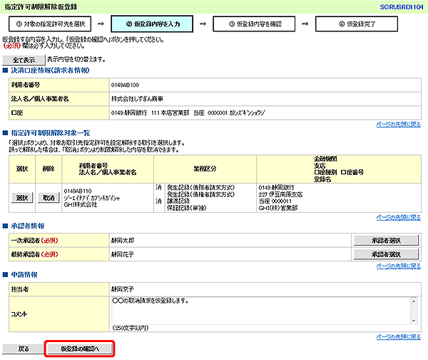 「指定許可制限解除仮登録確認」画面が表示されます。