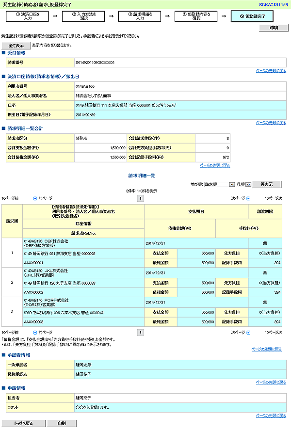 ただし、承認完了時点では、発生の成立は確定していません。承認完了後、発生記録(債務者請求)メニュー画面の請求状況一覧、または通知情報一覧画面にて結果を確認してください。