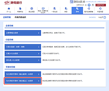 「しずぎんWEB−PCバンキングサービス」をご利用いただくための企業情報、先方負担手数料情報、口座メモ情報、委託者メモ情報を変更または照会することができます。