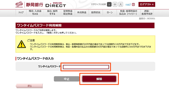 ③ パソコンの場合はワンタイムパスワード、スマートフォンの場合は取引用パスワードを入力し、「解除する」をクリックしてください。