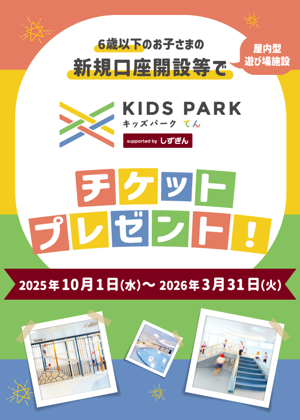 2025年10月1日〜2026年3月31日の間に6歳以下のお子さまの普通預金口座を開設いただいた方に、 KIDS PARK X(てん)の利用チケットを抽選で300名さまにプレゼントします。