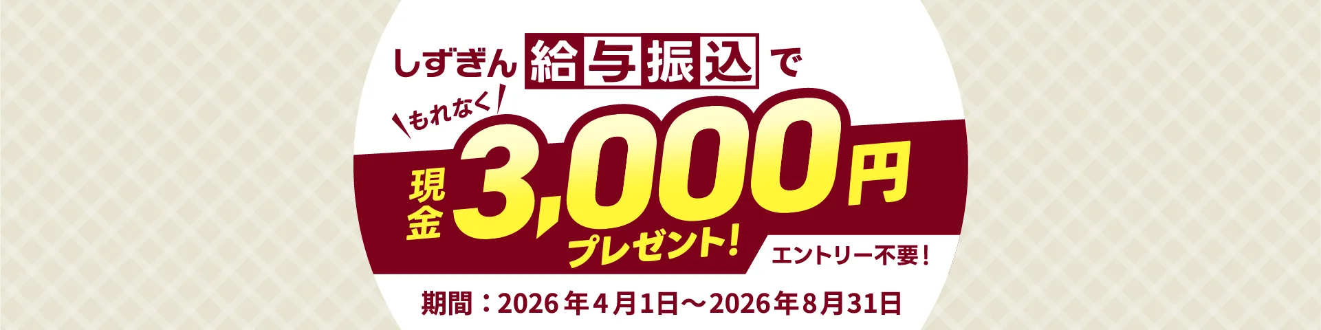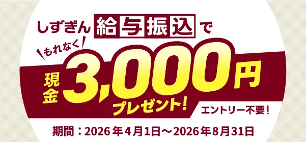 - 新たに静岡銀行の普通預金口座を給与振込口座に指定していただき、2026年8月31日までに1度に5万円以上の給与を受け取られた方が対象となります