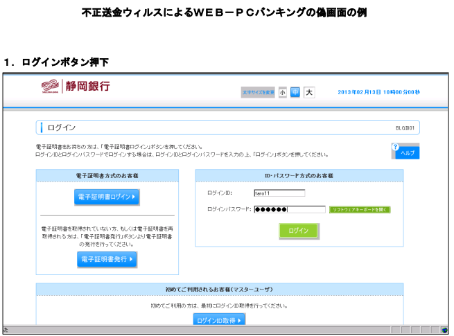 不正アクセスによりWEB-PCバンキングの偽画面で、ワンタイムパスワード等を盗み取られ、不正送金されてしまう被害が発生しています。