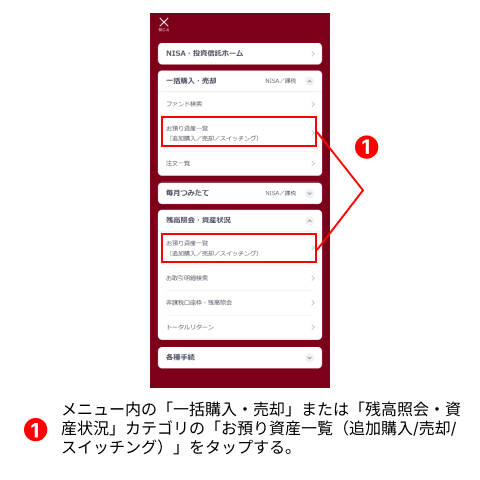 ログインしたら左上にある「メニュー」をタップし、「投資信託のお取引き」をタップします。